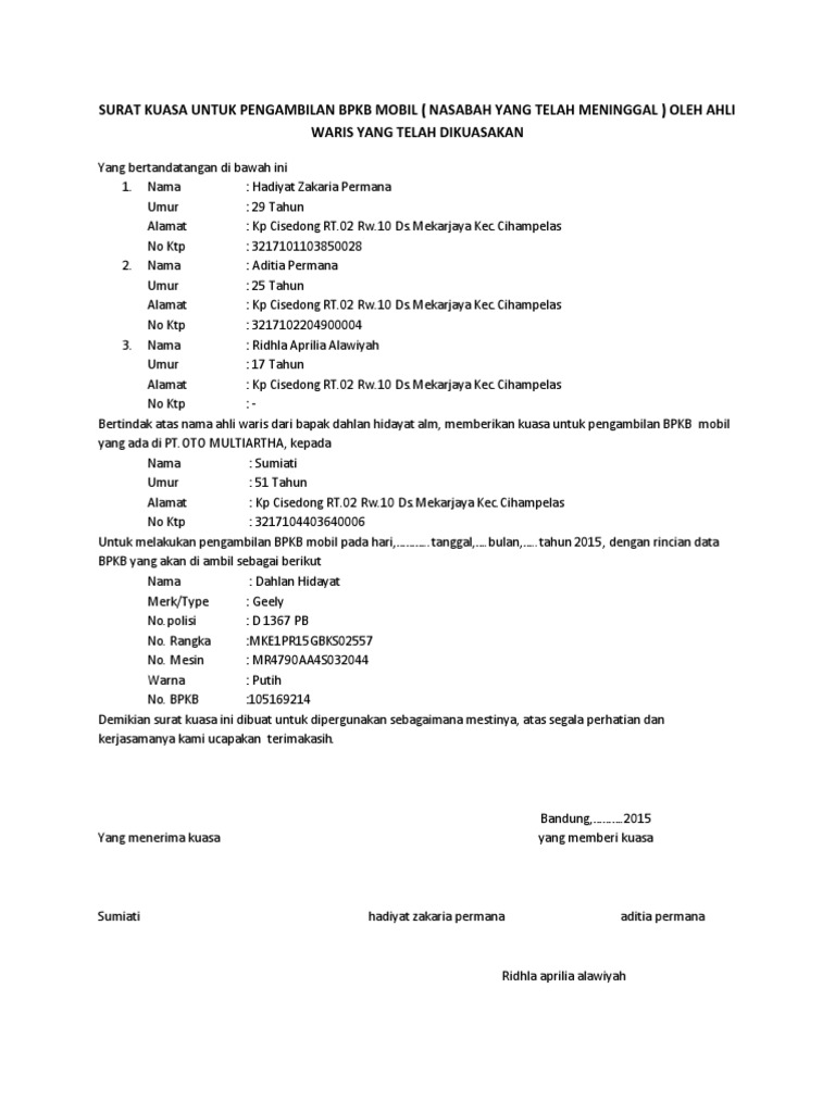 Berikut di bawah ini adalah contohnya yang bisa anda jadikan rujukan. Contoh surat kuasa pengambilan bpkb mobil. Surat kuasa pengambilan dokumen bpkb mobil. Saya yang bertanda tangan di bawah ini Selain surat yang perlu dibuat dan di cetak, kalian juga harus mempersiapkan syarat pengambilan bpkb motor atau mobil. Setelah membeli mobil, baik mobil baru atau mobil bekas, maka anda juga harus menyiapkan dana cadangan. Jadi jangan sampai surat kuasa. Surat kuasa pengambilan bpkb tersebut nantinya akan digunakan sebagai bukti bahwa bpkb sudah diambil oleh orang yang dikuasakan. Apa itu perjanjian pembelian mobil? No 934859 untuk melakukan penjualan harta warisan yang bentuknya rumah (tanah dan. Sebelum membuat surat kuasa, ada baiknya ketahui contoh surat kuasa yang baik dan benar terlebih dahulu. Tulisan ini membahas pengertian, fungsi, dan contoh surat kuasa yang sering kita butuhkan. Surat kuasa ini harus ditulis dengan menggunakan bahasa yang formal.